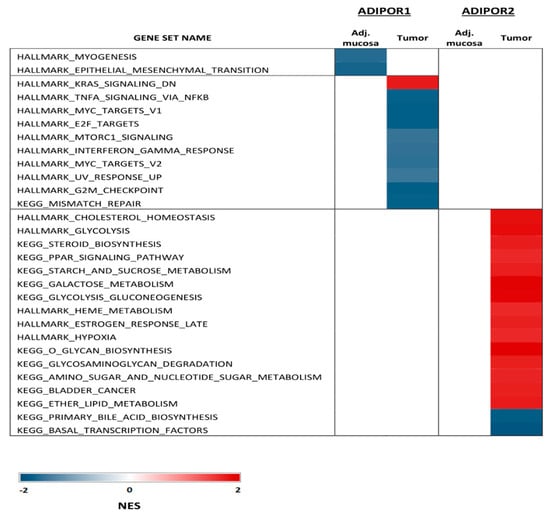 Significant signaling pathways associated with ADIPOR1 and ADIPOR2 mRNA levels in tumor tissue and healthy adjacent mucosa (GSEA of GSE 44076 dataset).