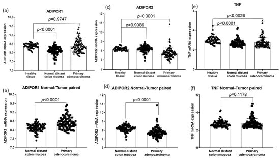 Differences in ADIPOR and TNF α mRNA levels among malignant tissue-adjacent mucosa and healthy tissue (GSE 44076 dataset). (a) Difference in ADIPOR1 mRNA levels between primary adenocarcinoma and healthy tissue and between adjacent mucosa and healthy tissue; (c) Difference in ADIPOR2 mRNA levels between primary adenocarcinoma and healthy tissue and between adjacent mucosa and healthy tissue; (e) Difference in TNF α mRNA between primary adenocarcinoma and healthy tissue and between adjacent mucosa and healthy tissue; (b) Difference in ADIPOR1 mRNA levels between primary adenocarcinoma and adjacent mucosa; (d) Difference in ADIPOR2 mRNA levels between primary adenocarcinoma and adjacent mucosa; (f) Difference in TNF α mRNA levels between primary adenocarcinoma and adjacent mucosa.