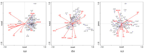 The results of one-way ANOVA showed an SD p-value > 0.05 (0.762); hence, they were not included in the environmental factors for CCA. The environmental factors selected for CCA were TN, TP, CODcr, WT, Cl−, pH, NH4+-N, EC, NTU, DO, and depth, and the chosen phytoplankton were species with an occurrence frequency of ≥10% during the sampling period, i.e., 54 phytoplankton species (Appendix A). They were analyzed from two aspects: seasons (spring, summer, and autumn) and study area (lake, river, and wetland).