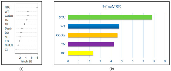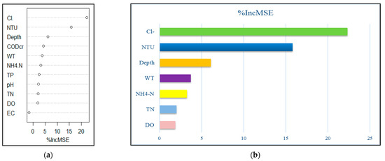 The 11 environmental factors explained 52.19% of total variance in summer, and the input feature importance ranking is shown in Figure 8a. Feature importance from the random forest cross-validation results (Figure 8b) showed Cl− (%IncMSE = 22.33), NTU (%IncMSE = 15.79), depth (%IncMSE = 6.090), WT(%IncMSE= 3.725), NH4+ -N (%IncMSE = 3.245), TN (%IncMSE = 2.024), and DO (%IncMSE = 1.870) as the important variables influencing phytoplankton in summer, explaining 53.63% of the total variance, which was higher than the previous value (52.19%). There was a deviation in the random forest result from that of CCA in summer.