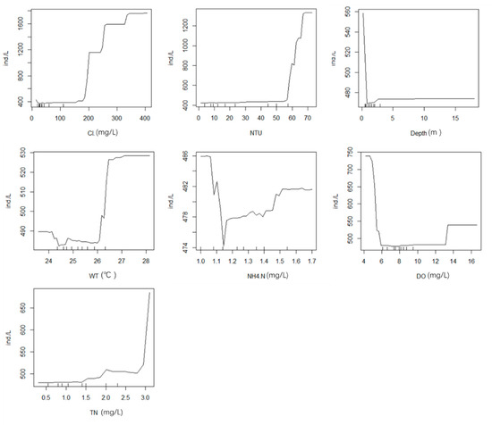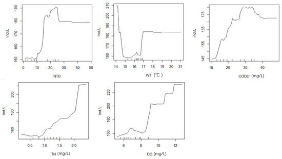 The random forest model with 11 environmental factors (TN, TP, CODcr, WT, Cl−, pH, NH4+-N, EC, NTU, DO, and depth) explained 26.22% of the total variance. Figure 6a presents the results of random forest analysis, showing the environmental variables ranked by importance. All models were trained and tested using tenfold cross validation, and the results (Figure 6b) revealed NTU (%IncMSE = 7.800), WT (%IncMSE = 4.753), CODcr (%IncMSE = 4.594), TN (%IncMSE = 4.244), and DO (%IncMSE = 2.329) as the important variables influencing phytoplankton in spring; these five factors explained 29.86% of the total variance, which was higher than the previous value (26.22%). These results are generally consistent with those of the phytoplankton CCA in spring. The relationship between environmental factors and phytoplankton is not a simple linear relationship. A nonlinear model (random forests) can better handle such cases. The line chart of the correlation between five main environmental factors and phytoplankton based on random forest (Figure 7) shows that phytoplankton abundance increased with higher concentrations of TN and DO. This indicates that increased TN and DO is conducive to abundant growth of phytoplankton in a certain range. WT in spring was low and did not exceed 17 °C; the line chart shows that, when WT was higher than 17 °C, the trend became a straight line, resulting in the water quality being clear in spring. At NTU values more than 30, the line in the figure became a straight line, indicating that the impact on phytoplankton reached the limit.