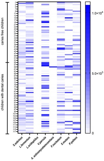 Dental caries etiology is a multifactorial interaction of four primary factors: host factors, cariogenic microorganisms growing on favorable substrates, and a low pH exposition time [,]. Children are particularly susceptible to this disease due to the low degree of enamel and dentin mineralization and thus are more vulnerable to infection caused by cariogenic bacteria. One of the main goals facing researchers is to correlate specific microbial species or communities with dental caries. The very first step in identifying the potential microbial factors is precisely describing the composition of the oral microbiota, which is critical in dental health and disease []. Recently, bacterial identification, listing and the particular role of microorganisms in health and disease have received increasing attention.