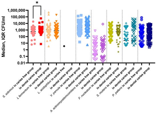 Lactobacillus spp. are highly acid-tolerant anaerobes, thriving in the acidic environment on active dentin carious lesions. Lactobacillus spp. were reported to significantly increase in the caries-active group []. Although in the current study, L. fermentum was one of the most frequent and abundant species, no significant difference was found between caries-free and dental-caries active groups. Formerly, L. salivarius was found practically exclusively in dentin caries, suggesting that this species might be more significant in the advanced stages of caries [,,]. Interestingly, in another study, Lactobacillus spp. was detected in caries-free subjects [], similar to the present study, where L. fermentum was found in comparable loads in caries-free children as well as in children with dental caries. In previous studies, Lactobacillus fermentum was the most common species isolated from carious lesions in Thai children []. The results for L. acidophilus, which were almost absent in the present study, are similar to previous reports and could not be correlated with caries [,].
