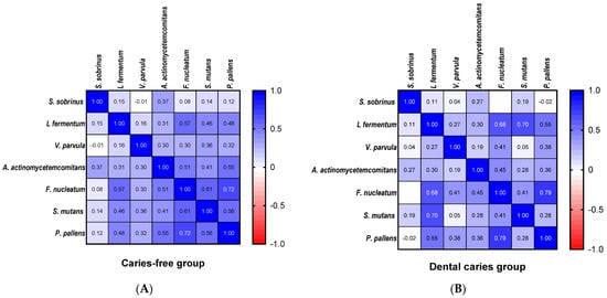 Correlation plot of the abundance of bacterial species. (A) caries free group, (B) dental caries group. (Spearman rank-order correlations test).
