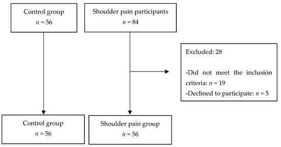 A total of 84 participants were initially screened for eligibility. Twenty-eight patients were excluded because they did not meet the inclusion criteria (ten were under 18 years old, thirteen participants suffered from less than three months of pain, and five patients had comorbidities that affect the execution of the proposed tests). The final sample was composed of 56 people with shoulder chronic pain. The distribution of the participants is shown in Figure 1.