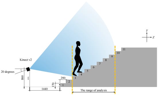 Kinect v2 (Microsoft, Redmond, WA, USA), an RGB-D sensor, was used to measure knee joint positions when climbing stairs. Kinect v2 has a skeleton tracking function that can automatically detect the position of joints based on the machine learning concept. However, it is often impossible to detect the knee joint positions when climbing stairs. The reason is that Kinect v2 does not contain the data acquired by the tilted sensor and needs to be tilted to capture the stair climbing []. Therefore, in this study, we used our previously suggested method to obtain the knee joint trajectories with Kinect v2 [,]. According to the previous method, we only used depth data captured from behind when climbing stairs. All data were sampled at 20 Hz. The experimental setup is shown in Figure 1. Kinect v2 was set at a distance of 1440 mm from the stairs, a height of 860 mm, and a tilt of 20 degrees as close as possible without interfering with walking so that it would fit within the angle of view. Since the start and end of walking included acceleration and deceleration (i.e., non-steady), the analysis range was set from an arbitrary step to the step before and was extracted from seven steps except the first and the last two steps.