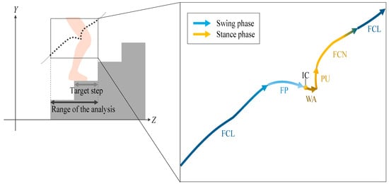 Since there was no significant difference in the time of the 11-SCT between ascending and descending in both KOA and the control group [], we focused on stair ascent in this paper. As an example, as shown in Figure 2, an arbitrary step knee joint trajectory in the sagittal plane was extracted for analysis. During stair walking, spatial position information of the body must be processed based on different reference planes between each step. The range of target steps on the depth (Z) axis was defined as the observed foot contact step, that is, the stair nosing of the step and the next step. One cycle of the knee joint trajectory was extracted for analysis in the range of two steps: the target step, including the stance phase, and the step before it. The stair climbing motion was divided into five sections: two for the swing phase and three for the stance phase, according to the previous method []. The swing phase consisted of foot clearance (FCL) and foot placement (FP), while the stance phase started from the initial contact (IC) and consisted of weight acceptance (WA), pull-up (PU), and forward continuation (FCN).