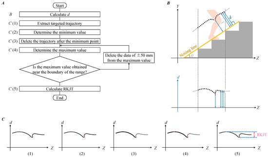 We proposed a method to analyze the knee joint trajectories using our previous method. Figure 3 shows the procedure of the proposed method. The flow is shown in Figure 3A. First, we calculated the distance from each knee joint position to the nosing line that was lined between stair nosing and defined as d (Figure 3B). Next, the d value was extracted in the analysis range on the Z axis (Figure 3(C1)). The minimum value was only detected when the foot stepped on (Figure 3(C2)), while two maximum values were detected before and after the minimum value. Since this study focused on the ending of FCL to the beginning of PU, where the knee joint moves greater in the d direction, the maximum value occurred during the swing phase before the minimum value was adopted (Figure 3(C3,4)). Finally, the range of knee joint trajectory (RKJT), as the proposed index, was calculated as the difference between the maximum and minimum values of d (Figure 3(C5)). When people climbed by stepping on the edge of the steps, the maximum value deviated from the target step, so the range of analysis should include the entire cycle. On the other hand, the wrong maximum value could be adopted in another case because the range of analysis was too wide. Therefore, when the maximum value was obtained near the boundary of the range, the data of ±50 mm from the maximum value was deleted, and the maximum value was obtained again. The threshold was determined in a try-and-error manner. All processes were automated.