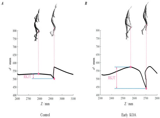 Comparison of RKJT values for K&L grades 0 and 1. (A) shows data for participants with K&L grade 0, and (B) shows data for K&L grade 1. The black lines show the analysis range, and the pink dots show the maximum and minimum points extracted. The four silhouettes correspond to the maximum and minimum values.