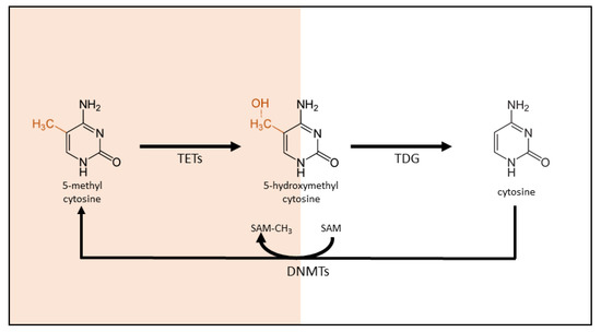 The DNMT family consists of four catalytically active members in humans: DNMT1, DNMT2, DNMT3A, and DNMT3B [35,36]. DNMT1 predominantly recognizes and copies pre-existing methylation profiles, whereas DNMT3A and DNMT3B induce de novo methylation [35]. The biological functions of DNMT2 remain elusive to this day, but it likely targets RNA, not DNA [36]. Although DNA methylation is relatively stable, the process is also reversible. The demethylation process can occur either in an active or passive manner. Active DNA methylation is independent of DNA replication and requires enzyme activity. Direct demethylation of 5mC to cytosine does not occur, despite earlier claims [37]. Instead, in vivo conversion of 5mC to cytosine involves the replacement of the methylated nucleotide. The first step in this demethylation process is 5mC oxidation by the ten-eleven translocation methylcytosine dioxygenases (TET) to generate 5-hydroxymethylcytosine and further oxidized 5-formyl and 5-carboxycytosine. In the second step, the modified cytosine is replaced with a new, unmodified cytosine through DNA damage repair pathways, presumable involving base excision repair [37]. The passive process occurs during the DNA replication process when DNMT1 is halted, and the copying of the methylation profiles on the new strand fails. The newly synthesized strand is thus not methylated, and the methylation mark is mitigated over time [37,38]. In a third hybrid process, 5mC is first converted to 5hmC by TETs. This base is not recognized by DNMT1 during replication, leading to a failure to copy the DNA methylation mark onto the newly synthesized DNA strand.