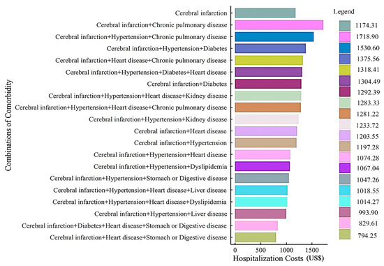 The 20 most frequently related comorbidities accompanying cerebral infarction are listed in Figure 1. Based on the average hospitalization costs, the top seven were reported to be (1) cerebral infarction + chronic pulmonary disease (US $1718.90), (2) cerebral infarction + hypertension + chronic pulmonary disease (US $1530.60), (3) cerebral infarction + hypertension + diabetes (US $1375.56), (4) cerebral infarction + heart disease + chronic pulmonary disease (US $1318.41), (5) cerebral infarction + hypertension + diabetes + heart disease (US $1304.49), (6) cerebral infarction + diabetes (US $1292.39), and (7) cerebral infarction + hypertension + heart disease + kidney disease (US $1283.33) (Figure 1).