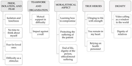 Table 2 describes the sample’s socio-demographic characteristics. The researchers identified five main themes: (1) pride, isolation, and fear; (2) teamwork and organisation; (3) moral/ethical aspect; (4) true heroes; and (5) dignity of the affections (Figure 1).