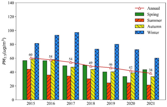 Figure 2 shows the annual and seasonal variations in PM2.5 concentrations in the YRB from 2015 to 2021. From 2015 to 2021, the inter-annual variation of PM2.5 concentrations in the YRB demonstrates a decreasing trend, from 60 µg/m3 in 2015 to 38 µg/m3 in 2021. In terms of inter-season scale, the highest average PM2.5 concentrations occurred in winter, followed by spring and autumn, while the lowest PM2.5 concentrations occurred in summer. The highest PM2.5 concentrations occurred in winter 2017, at 97 µg/m3, and the lowest, at 21 µg/m3, in summer 2021. In general, the seasonal variation of PM2.5 concentrations in the YRB presents a fluctuating downward trend from 2015 to 2021. In addition, compared with other seasons, the trend in PM2.5 concentrations is more significant in winter.