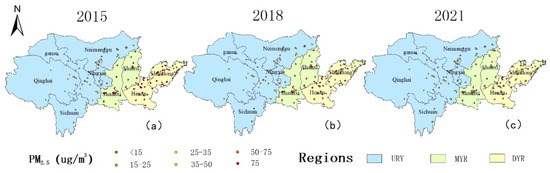 Spatial distribution of PM2.5 annual average concentrations in the Yellow River Basin from 2015 to 2021 (a–c). (UYR denotes the Upper Yellow River Basin, MYR denotes the Middle Yellow River Basin, and DYR denotes the downstream area of the Yellow River Basin).