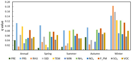 The inter-annual and inter-season q-values of the driving factors on PM2.5 concentrations in the Yellow River Basin. (PRE denotes the accumulated precipitation; PRS denotes the surface air pressure; RHU denotes the 2-meter relative humidity; SSD denotes sunshine duration; TEM denotes air temperature; WIN denotes the 10-meter wind velocity; NH3 denotes ammonia; NOx denotes nitrogen oxides; P_PM denotes primary PM2.5; SO2 denotes sulfur dioxide; VOC denotes volatile organic compounds).