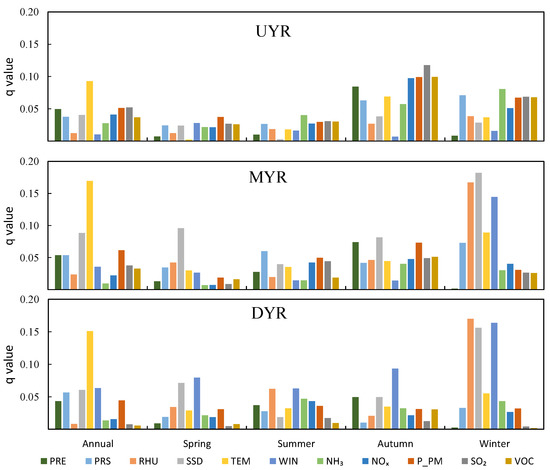 The inter-annual and inter-season q-values of the driving factors on PM2.5 concentrations in the sub-basin of the Yellow River Basin. (UYR denotes the Upper Yellow River Basin; MYR, denotes the Middle Yellow River Basin; DYR, denotes the downstream area of the Yellow River Basin; PRE denotes accumulated precipitation; PRS denotes surface air pressure; RHU denotes 2-m relative humidity; SSD denotes sunshine duration; TEM denotes air temperature; WIN denotes 10-m wind velocity; NH3 denotes ammonia; NOx denotes nitrogen oxides; P_PM denotes primary PM2.5; SO2 denotes sulfur dioxide; VOC denotes volatile organic compounds).