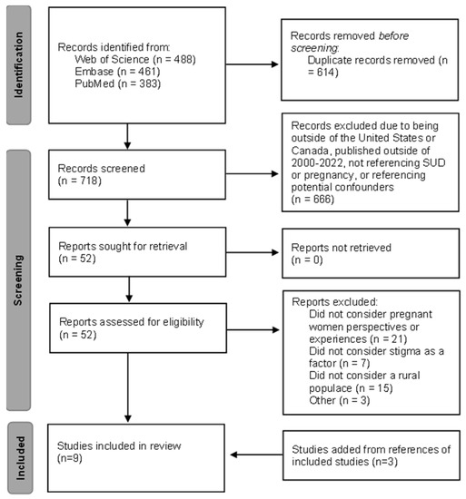 Information databases used to conduct the literature search included PubMed, Web of Science, and Embase. The literature search identified relevant literature published through 7 August 2022 using the following keywords: pregnancy, substance abuse, stigma, and rural. Variations of the keywords (i.e., substance abuse and substance use disorder) and variable word combinations were employed. Language such as abuse was used to identify older articles and those that include severe misuse without clearly defining SUD. Additional identification resulted from snowball sampling by reviewing citations in each selected article and searching for research that cited the selected articles. Figure 1 provides further details regarding the search strategy.