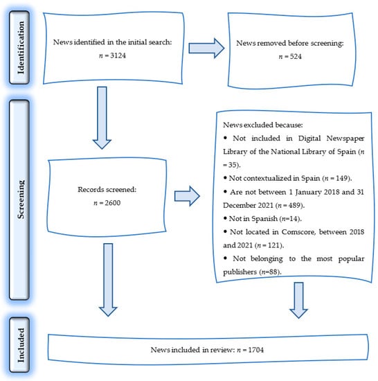 The PRISMA 2020 statement guidelines were also used for searching and selecting news from digital newspapers [22] (Figure 1).