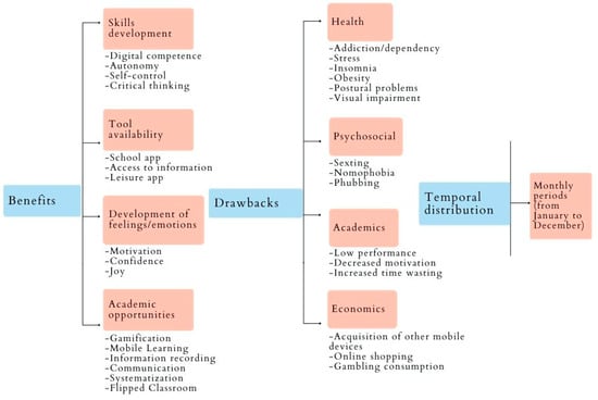 The inductive procedure was followed when categorizing data for first-level coding, based on the three research questions (Table 1). The deductive process was combined with the inductive process for 2nd and 3rd level coding. A deductive process was followed for 2nd level coding associated with smartphone use benefits, drawbacks, and temporal distribution. However, since no taxonomy was identified in the theoretical corpus to delimit the codes for 3rd level sub-categorization, an inductive process was chosen, which provided an unpublished codification [23].