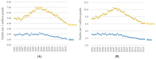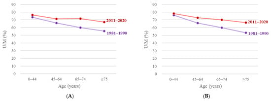 In the period between 1981 and 1990, SSc was selected as the UCD in 62.6% of MCD cases. As the age of the deceased increased, this proportion declined. In 1981–1990, among male decedents aged 0–44 and ≥75 years, the UCD/MCD ratio was, respectively, 73.4% and 55.5%, but it increased to 76.6% and 67.1% in 2011–2020. For both sexes, the proportion of death in SSc attributed to UCD/MCD ratio decreased steadily with increasing age. However, the ratio rose slightly among males aged 65–74 years, from 71.3% to 71.8%. Ratanawatkul et al. [] indicated a similar pattern using UCD and MCD data. Among patients with SSc, the risk of dying from cancer, cardiopulmonary complications, infections, or malignancies increases with age; consequently, SSc is less likely to be selected as the UCD in such cases.