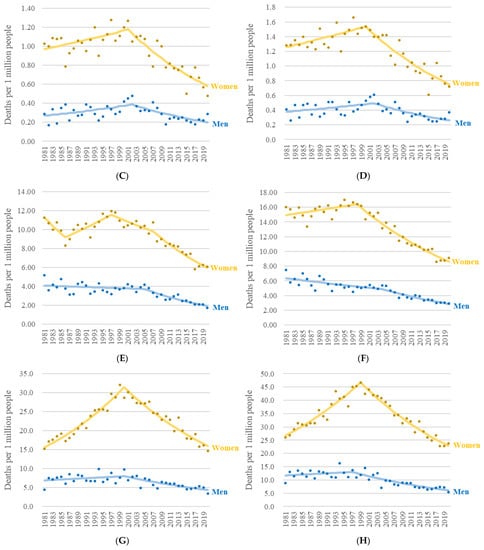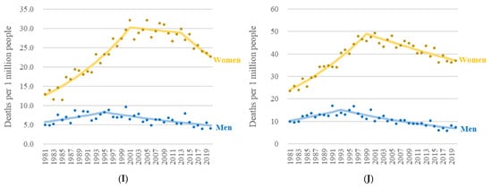 This study will involve two definitions of death: UCD and MCD. The definitions were derived from the ICD-10 Instruction Manual []. UCD refers to the disease or injury that launched the sequence of morbid events that led directly to death, or the accident or act of violence that caused the fatal injury. Otherwise, MCD comprises not only the UCD, but also the immediate cause of death (Supplementary Figure S1) and any intermediate and contributing conditions stated on the death certificates. According to the UCD and MCD data, the number of deaths and ASMR were classified (deaths per one million people) into four age categories (0–44, 45–64, 65–74, and ≥75 years old) by sex for 1981–1990 and 2011–2020. The mortality rate for all ages was adjusted for age using the population of the United States in 2000 as a reference.