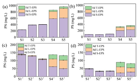 Changes in EPS in the liquid phase after ferrate pretreatment and digestion ((a) PN concentration after pretreatment, (b) PS concentration after pretreatment, (c) PN concentration after digestion, and (d) PS concentration after digestion).
