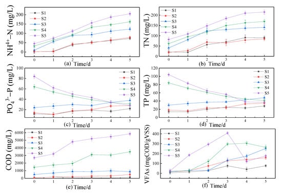 Variation of liquid pollutant concentration with digestion time ((a), (b), (c), (d), (e) and (f), respectively, are the changes of NH4+-N, TN, PO43−-P, TP, COD and VFAs concentrations during 5 days).