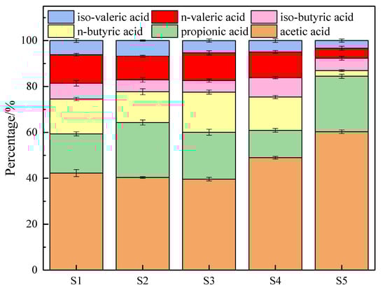 In the process of sludge anaerobic digestion, VFAs are mainly composed of acetic, propionic, n-butyric, iso-butyric, n-valeric, and iso-valeric acids []. The proportion of six acids in five groups on the third day (the day when the VFA accumulation reached the maximum) of digestion is shown in Figure 3. Acetic acid was the most widely used organic acid [], and the percentage of acetic acid ranked first in all groups (42.26%, 40.36%, 39.65%, 49%, and 60.29%) because, in addition to acetic-acid-producing bacteria directly converting organic matter into acetic acid, other organic acids (propionic acid, butyric acid, valeric acid, etc.) can also be degraded into acetic acid under the catalysis of related enzymes. It can be seen that after pretreatment, the proportion of acetic acid in S4 and S5 was the largest. After pretreatment, the concentrations of propionic acid decreased after acidic ferrate pretreatment (S4) (11.89% vs. 23.94% in S2) and the concentrations of n-butyric acid decreased after alkaline ferrate pretreatment (S5) (2.49% vs. 17.47% in S3). After pretreatment, the total proportion of acetic acid and propionic acid in all groups increased (64.3%, 60.07%, 60.89%, 84.46% vs. 59.37% in S1). After 3 days of digestion, iso-butyric acid and iso-valeric acid changed the least. This may be because n-butyric acid and n-valeric acid are linear organic acids, while iso-butyric acid and iso-valeric acid have branched chains and find it more difficult to convert into other small molecular acids []. The data showed that ferrate pretreatment (S4, S5) not only accelerates acid production, increases VFAs concentration, and achieves the goal of efficiently accumulating small molecular acids, but also effectively increases the proportion of acetic acid. Compared with S4, S5 had a better acid production effect.