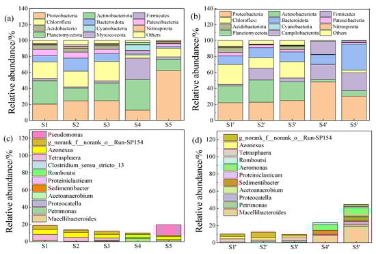 The composition, diversity, and structure of bacterial communities after pretreatment and after 5 days of digestion were measured by high-throughput sequencing. S1, S2, S3, S4, and S5 are the microbial samples after pretreatment, and S1′, S2′, S3′, S4′, and S5′ are the microbial samples after 5 days of digestion (Figure 4). After different pretreatments, the composition of phylum microorganisms was different (Figure 4a). After pretreatment with ferrate (S4, S5), the sludge structure was destroyed and microorganisms were released. However, 39 identical categories were detected in all five groups, which indicated that this concentration of iron did not break the microbial cells and affected the microbial richness. Compared with the blank control group (S1), the microbial composition of the acid blank control group (S2) and the alkaline blank control group (S3) did not change much. Chloroflexi, Bacteroidota, Proteobacteria, Firmicutes, and Actinobacteriota changed greatly after pretreatment with ferrate (S4, S5). The total proportion of Chloroflexi and Bacteroidota decreased the most after alkaline ferrate pretreatment (S5) (12.87% vs. 34.02% in S3). The proportion of Proteobacteria changed differently after acid ferrate pretreatment (S4) and alkaline ferrate pretreatment (S5), as it decreased greatly for S4 (12.77% vs. 24.32% in S2) and increased sharply for S5 (62.34% vs. 24.59% in S3). The growth rate of Firmicutes after acidic ferrate pretreatment (S4) (27% vs. 1.53% in S2) was higher than that after alkaline ferrate pretreatment (S5) (2.91% vs. 2.66% in S3). Actinobacteriota did not change after alkaline ferrate pretreatment (S5) but increased a great deal after acidic ferrate pretreatment (S4) (38.17% vs. 16.01% in S2).
