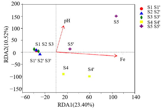 There was a correlation between microorganisms at the genus level and different environmental factors (Figure 5). The influencing factors are pH and adding Fe. R2 related to pH is 0.9997 and that related to the addition of Fe is 0.9994. After pretreatment and digestion for 5 days, the microorganisms of three blank control groups (S1 and S1′, S2 and S2′, S3 and S3′) changed slightly, while those of ferrate pretreatment (S4 and S4′, S5 and S5′) changed a great deal, and the main influencing factor was iron. The results showed that the addition of Fe was the main influencing factor, which had a correlation with microbial changes. Iron-added components all promoted the growth of microorganisms, and the influence of alkaline ferrate pretreatment (S5′) was greater than acid ferrate pretreatment (S4′). For alkaline ferrate pretreatment (S5 and S5′), pH had a positive correlation, while for acid ferrate pretreatment (S4), pH had a negative correlation, which showed that, in this experiment, the effect of acid ferrate pretreatment (S4 and S4′) on promoting microbial growth was not as good as alkaline ferrate pretreatment (S5 and S5′). At the same time, from the three blank groups, pH had only a slight effect on them.
