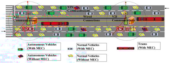 From what can be seen in Figure 1, there are five categories of vehicles, which are autonomous vehicles (with MEC), autonomous vehicles (without MEC), normal vehicles (with MEC), normal vehicles (without MEC), and trams (with MEC). It is worth noting that the trams can appear in the coverage area of some RSUs, while other RSUs do not cover them, since a limited number of trams operate on the track at a slow speed. For the RSUs as shown in Figure 1, all the RSUs are wired and connected with a high-speed ethernet backbone. For the vehicles in the coverage area of the RSU, they are communicating with the RSUs using V2I communications, while the vehicles outside the coverage area of the RSU relay information using V2V communications.