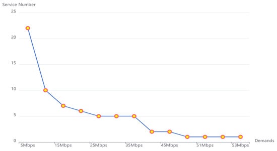 For the three algorithms (JF, H and D), in order to test out the maximum number of services that could run simultaneously for different communication demands, starting from S = 1, we increased the number of services at intervals of 1 until there was no feasible solution. Consequences show that, if given same communication demands, the maximum service number of the three algorithms (JF, H and D) are all the same. Experimental results showed that for smaller demands, more service numbers could be run simultaneously for the SDN RSU cloud. The detailed experimental results are shown in Figure 4 below.