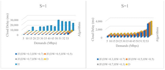 When comparing the D algorithm with the JF algorithm, which has three different hyperparameters configurations, it is obvious that, for the vast majority of S instances, the JF algorithm can achieve a network delay close to the D algorithm, and it can also reduce the number of hosts. Therefore, the JF algorithm is a better algorithm that takes both the delay and the number of hosts into account. Further observation and comparison of the H, JF and D algorithms shows that, though H algorithm has a much smaller number of working hosts for each S instance, the delay for the entire SDN RSU cloud increased explosively. What is more, the delay of the H algorithm increased by an order of magnitude when compared with the JF and D algorithms; therefore, an H algorithm that completely sacrifices the quality of network delay is obviously not desirable for the SDN RSU cloud. For the global comparison of all three algorithms’ cloud delay consequences under all demands, since feasible solutions only exist in S = 1 instance when demands D ≥ 50 Mbps, the S = 1 instance was taken for analysis and is shown in Figure 5.