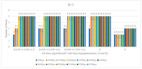 From what can be seen in Table 6, it is straightforward to find that, for 15 Mbps and 20 Mbps, regardless of the H algorithm results, JF (DW = 0.3, HW = 0.7) and JF (DW = 0.5, HW = 0.5) tended to have slightly larger delays and more working hosts with more energy consumptions when compared with the D algorithm, which is in accordance with the results analyses of Table 4 and Table 5. For example, in the case of 15 Mbps, when S = 1, 2, 4, 5, 6, Table 6 shows that the D algorithm usually had a smaller delay and a larger number of working hosts with slightly more energy consumption. Although the results of JF (DW = 0.7, HW = 0.3) were relatively close to the D algorithm, there were often the cases where the D algorithm increased the number of hosts with more energy consumptions in order to pursue a relatively slightly smaller delay. For example, when the communication demand was 20 Mbps with S = 2, the delay, the number of hosts, and energy consumptions of JF (DW = 0.7, HW = 0.3) were 434.16 ms, 11, and 7, respectively, while those of the D algorithm were 434.02, 12, and 8, respectively.