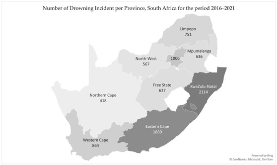The results indicate that drownings are most prevalent in KwaZulu-Natal, with 2114 drownings over the six-year period. Factors that could contribute to the fatal drowning burden include the province being the largest in geographical size; having the most water-related environments; experiencing a sub-tropical climate, which allows for swimming throughout the year; and having the largest population size among the nine provinces [24,25]. This epidemiological information guides drowning prevention strategies and aids in the design and implementation of drowning prevention interventions to ensure they are specific to the geographical regions.