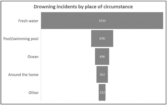 The place and circumstance of the drownings were categorized into freshwater (which includes canals, dams, dipping tanks, ditches, dongas, gully holes, lagoons, mineshafts, reservoirs, rivers, stormwater pipes, streams, swamps, wells, etc.), pools or swimming pools, the ocean (which includes harbours, sea or salt water), around the home (which includes baths, buckets of water, drums of water, fish ponds, fountains, toilets, septic tanks), and others (where drowning location is not specified). The highest number of drownings occurred in freshwater, with 3713 drownings reported from 2016 to 2021; this is illustrated in Figure 2.