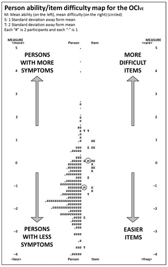- Person Separation Index (PSI) and OCIVE levels of performance. PSI is a measure of the discriminating capacity of a questionnaire. A PSI of two is the minimum accepted level of discrimination for an instrument to produce a valid measure [38]. The number of different levels of performance was calculated, according to a method suitable for clinical samples described by Wright [29,39].