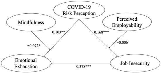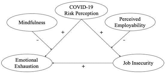 In a previous study, employees exposed to the threat of unemployment exhibited higher levels of negative emotions, such as stress and exhaustion, than employees not exposed to this risk []. Among employees, job insecurity can lead to loss of resources, exhaustion, burnout, and reduced well-being []. During the COVID-19 pandemic, the job insecurity experienced by hospitality employees can potentially deplete their resources and exacerbate emotional exhaustion. Arguably, therefore, COVID-19 risk perception could indirectly affect frontline employees’ emotional exhaustion through job insecurity. We thus propose: