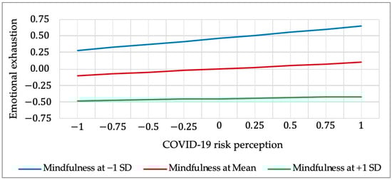 In addition, the interaction role of mindfulness between COVID-19 risk perception and emotional exhaustion was negative and significant (β = −0.072, p < 0.05). Figure 3 shows the simple slope test results. As indicated in Figure 3, employee mindfulness buffered the positive association between COVID-19 risk perception and emotional exhaustion. The buffering effect of employees with higher level mindfulness (1 SD above the mean) was greater than those with lower level mindfulness (1 SD below the mean). Thus, Hypothesis 5 was supported. However, the moderating effect of employability between COVID-19 risk perception and job insecurity was not significant, therefore Hypothesis 6 was not supported.