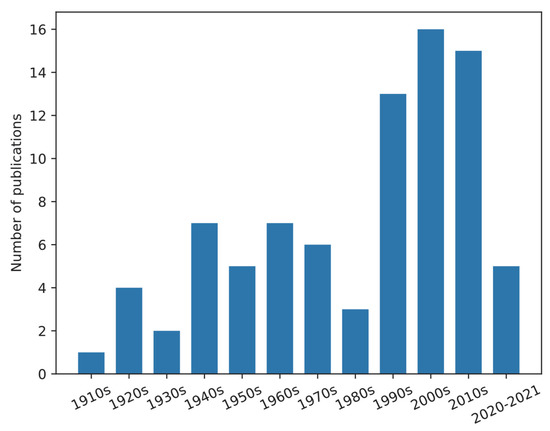Publications of chigger studies in the US were searched on the Web of Science on 3 March 2022 (Table S1), showing 115 papers of which 83 were directly on chiggers. The number of publications on chiggers in the US is shown in Figure 1. Publications were summarized and shown in Table S2. The publications mainly focused on taxonomy (identification methods), ecology, and reports of the discovery of chiggers on various hosts in the US. Chigger research in the US started in the 1910s. The number of publications gradually increased from 1920 to 1979 followed by a drop in the 1980s. From 1990 till now, the number of publications per decade on this topic was 13–16. However, these data do not include all of the existing published papers, especially the older papers. For example, as stated in the world checklist of Trombiculidae and Leeuwenhoekiidae from Nielsen et al. [5], H.E. Ewing described 64 new chigger species from 1913 to 1950. Nielsen et al. listed 23 Ewing’s publications and five were marked as cited by other researchers. Based on our search results, there were only 10 papers published by Ewing that were available on the Web of Science, but additional papers were available at our institutional library.