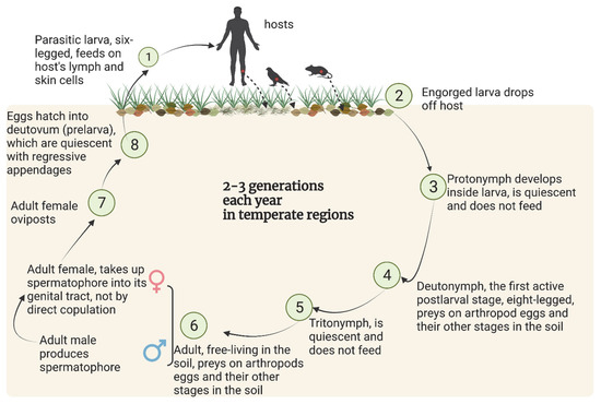 The typical life cycle of chiggers. Created with BioRender.com. Data sources: [11,13,14].