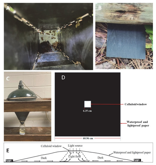 Chigger collecting methods: (A) live-trapped rodents in Sherman traps (photo credit to Reuben Garshong); (B) black tile on the ground; (C) Berlese funnel (photo credit to Steve Denning); (D) light trap (modified from [29]); (E) horizontal view of light trap, arrows inside the trap show the paths taken by chiggers (modified from [29]).