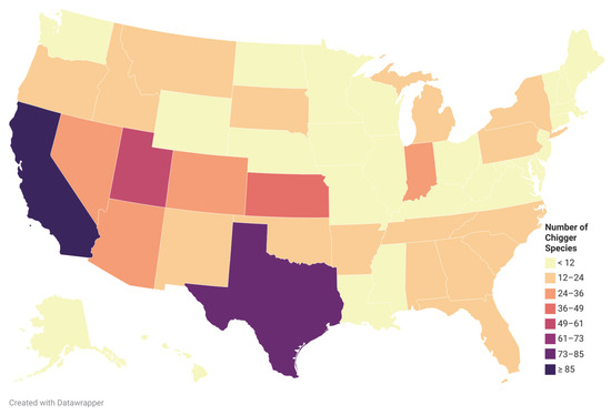 Chigger species richness in the US. Created with Datawrapper. Data sources: [17,45].
