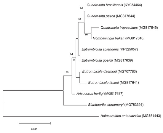 Neighbor-Joining tree of small subunit rRNA sequences of chiggers collected from North and South American countries. The chigger small subunit rRNA sequences data were downloaded from GenBank only from peer-reviewed journal publications. The Halacaroides antoniazziae (MG751443) was used as an outgroup. The percentage of replicate trees in which the associated taxa clustered together in the bootstrap test (1000 replicates) are shown below the branches. The tree was drawn to scale, with branch lengths in the same units as those of the evolutionary distances used to infer the phylogenetic tree. The evolutionary distances were computed using the Kimura 2-parameter method and are in the units of the number of base substitutions per site. This analysis involved 10 nucleotide sequences. All positions containing gaps and missing data were eliminated (complete deletion option). There were a total of 403 positions in the final dataset. Evolutionary analyses were conducted in MEGA11.