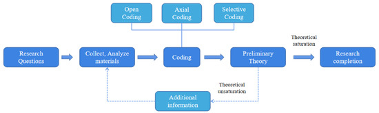 GT is a qualitative research method jointly proposed by Anselm and Barney of Columbia University [17]. As a research methodology, GT can help to better understand the nature and characteristics of problems, and then construct new theories [18]. It is a systematic approach that begins with an inductive query and ends with collecting, analyzing data, and building an underlying theory [19]. During the process of GT, the researcher is required to remain open-minded and conduct a careful evaluation of observations and evidence. Specifically, this process includes three steps: open-ended coding, axial coding, and selective coding. In our study, we use the GT method to identify the influencing factors and the mechanism of online learning for college students. The steps of the GT study are shown in Figure 1.