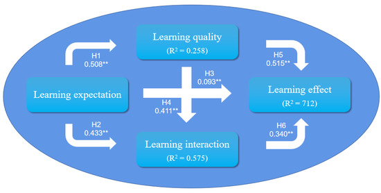 It is found that LI was a mediating factor between LE and LR during the online learning process. In other words, LE affects the LI, which in turn affects the LR. Specifically, the college student’s desire and demand for interaction with online learning were easily motivated when their LE was appropriately satisfied. Subsequently, college students may be involved in a positive communication environment with teachers, classmates, and course resources. The college student may obtain more knowledge and skill through teacher–student, student–student, and student–media interactions during online learning. As several researchers have pointed out [33], LE was a progressively changing psychological status according to the experience of the students’ constant reaction to information from different sources. Furthermore, students promote their behaviors by perceiving the results of their behaviors. According to Tolman’s symbol learning theory [34], learning is an activity with practical meaning, which is guided by a specific goal and involves the formation of expectations. In other words, learners’ behavior is guided by their expectations, i.e., their behavior is purposeful. In other words, the participation rate and quality of online learning of the student will be affected by their LE. When students’ LE is supported [35], they may show more satisfaction and increase the frequency of LI during online learning. Moreover, teacher–student interaction was one of the most direct positive factors influencing students’ online experience [36]. At the same time, immediate feedback from the teacher was vital to students’ online course performance [37]. Our research findings are consistent with the constructivist learning theory [38], which shows that learning activities are a process for students to achieve meaningful construction of knowledge through collaboration and conversation between teachers and classmates in certain scenarios. According to respondent No. 79, “my teacher always responded to me promptly, and I was so proud to be praised by her for being a brave person to ask questions. I like to introspect and try to solve some difficult things when I am encouraged by my teacher so that I can gain more knowledge and skill beyond the book”. According to the interview, timely feedback to students given by teachers would increase the opportunities for their thinking, communication, and acquisition of LR.