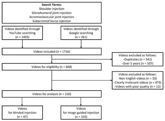 Flowchart for searching videos of shoulder injection treatments on YouTube and Google.