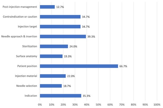 Percentage of videos scored in each of the 10 domains of the shoulder injection score.