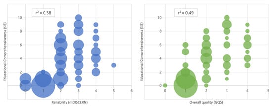 Figure 3 shows that there was a weak positive relationship between the mDISCERN score and SIS (r2 = 0.38). Moreover, a moderate positive relationship was observed between the GQS and SIS (r2 = 0.49). The correlation coefficient by domain is summarized in Figure 4.