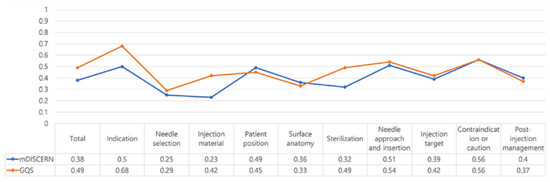 Among the 10 domains, correlation coefficients of 0.5 or higher in both comparisons are indication, needle approach and insertion, and contraindications or cautions. Meanwhile, the domains that showed a weak positive correlation between the mDISCERN and SIS were needle selection, injection material, surface anatomy, sterilization, and injection target. Needle selection, surface anatomy, and post-injection management showed a weak positive correlation between the GQS and SIS.